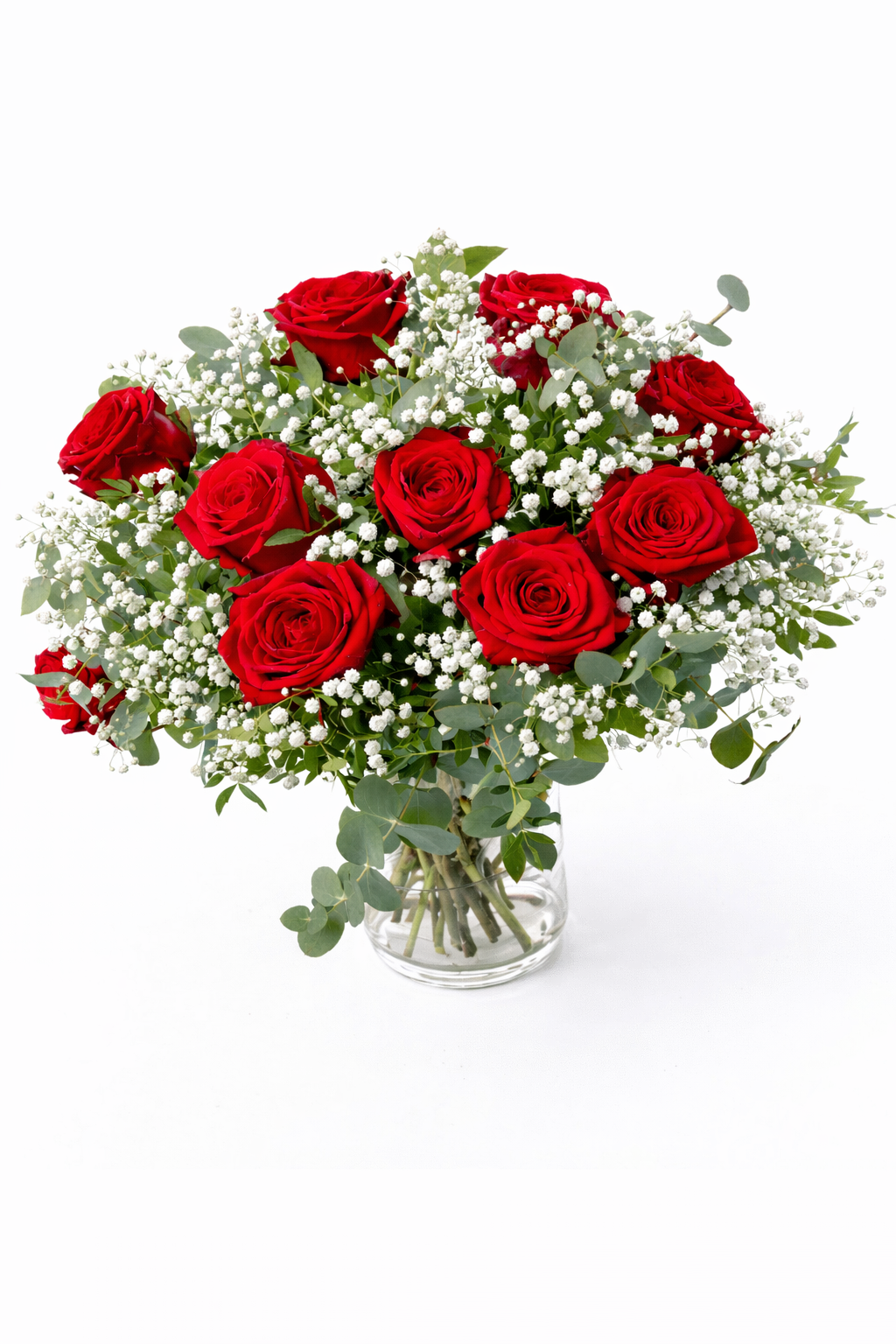 10 roses rouges avec gypsophiles dans un vase